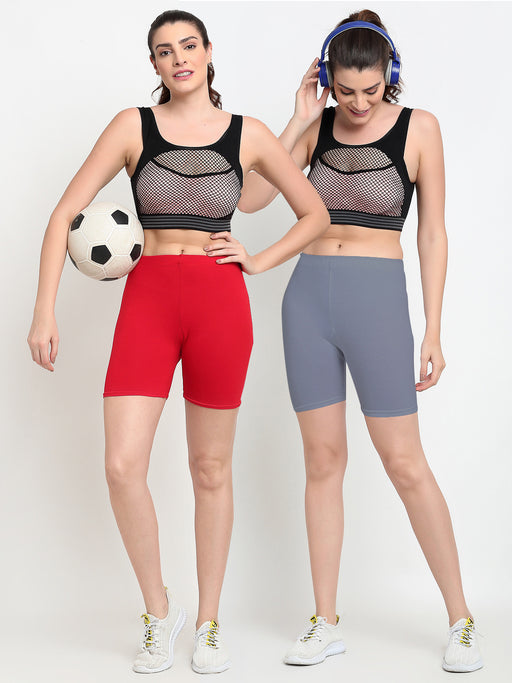 Women Red Grey Four way super commed lycra Cycling Shorts