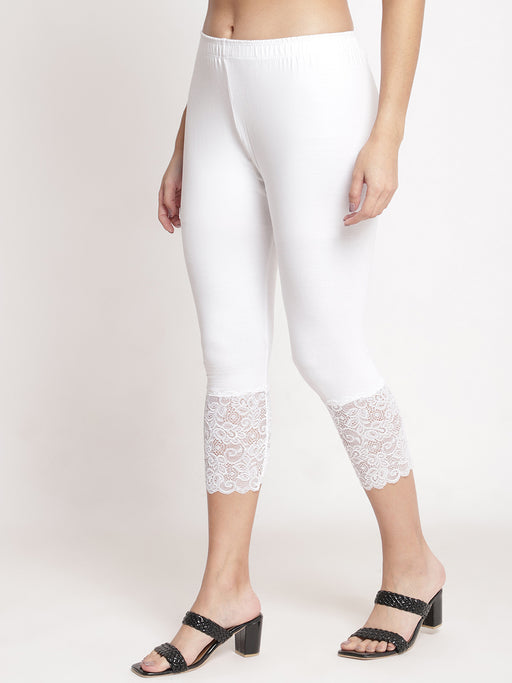 In stockWomen Super Combod Cotton Lycra Fabric Solid Design capri & Lace Hem are a stylish piece of casual clothing. Featuring a mid-rise, soft, elasti...
